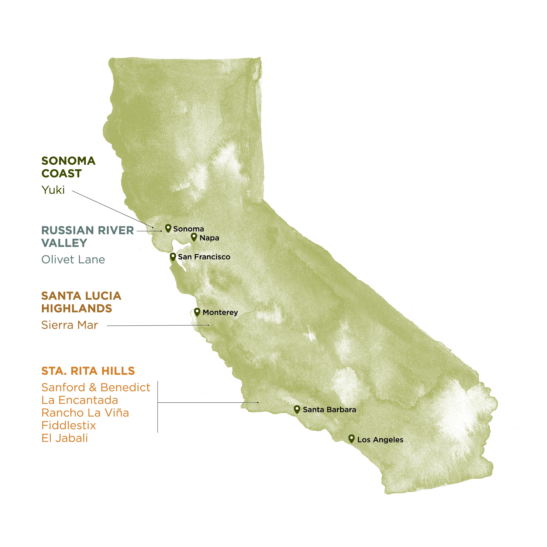 With a particular affinity for the Central Coast, our wines have been made from the historic vineyards Sanford & Benedict, La Encantada, and Sierra Mar, while also sourcing from Olivet Lane, and Yuki vineyards in the Sonoma Coast.